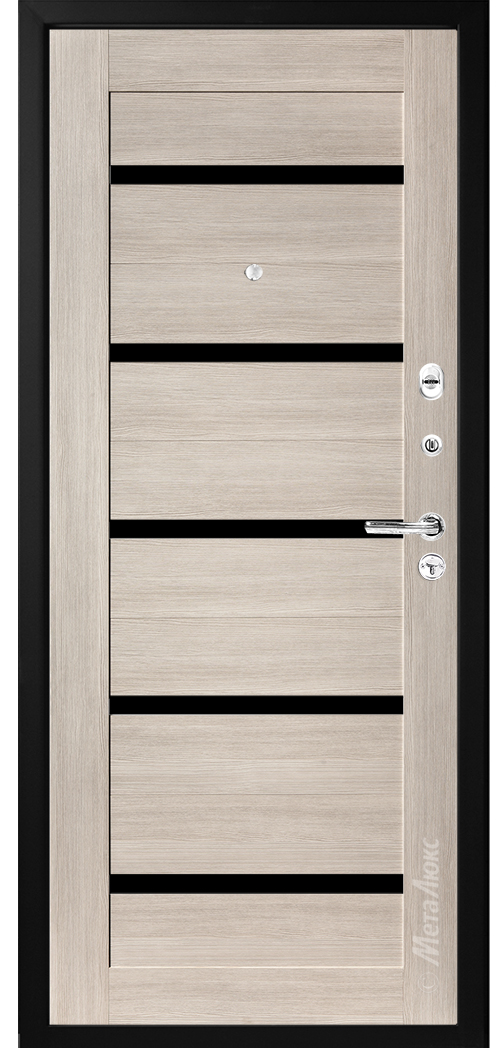 Отделка внутри царговая панель МДФ высокой плотности 16 мм, цвет «Лиственница кремовая», вставки из черного глянцевого стекла