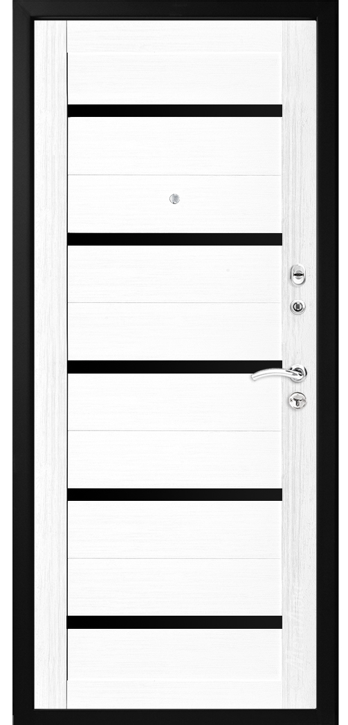 Отделка внутри | Царговая панель 16 мм, цвет «Ясень белый», вставки из черного глянцевого стекла |