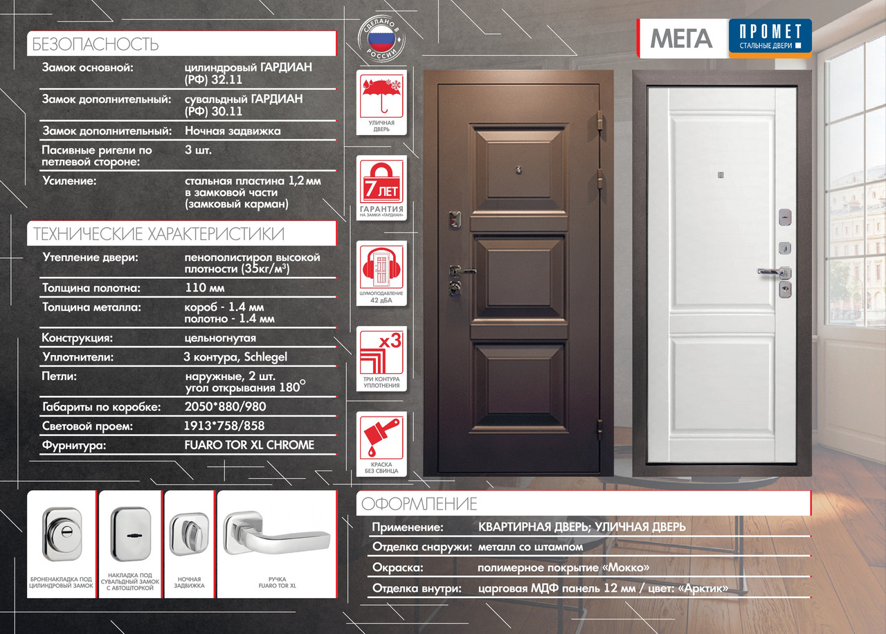 Замковые системы | Верхний - сувальдный "ПРОМЕТ", 3 ригеля 16 мм, РФ (2-й класс взломостойкости) |