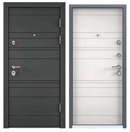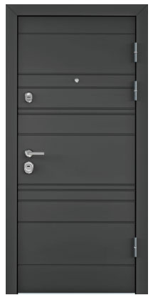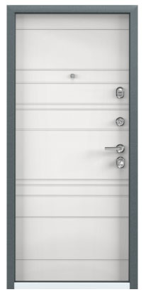 - Противосъемные ригеля, девиатор, двойной контур уплотнителя, металлический эксцентрик, глазок с металлической шторкой и широким углом обзора, накладной порог из нержавеющей стали