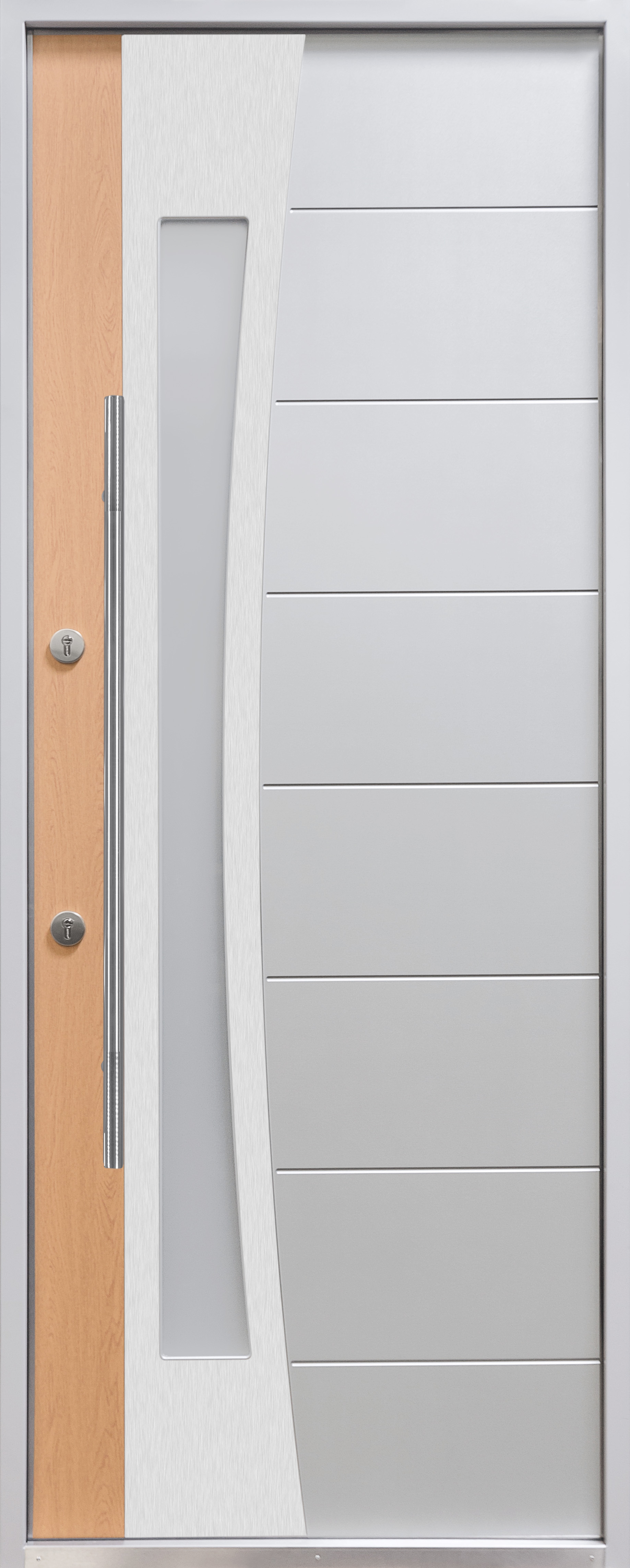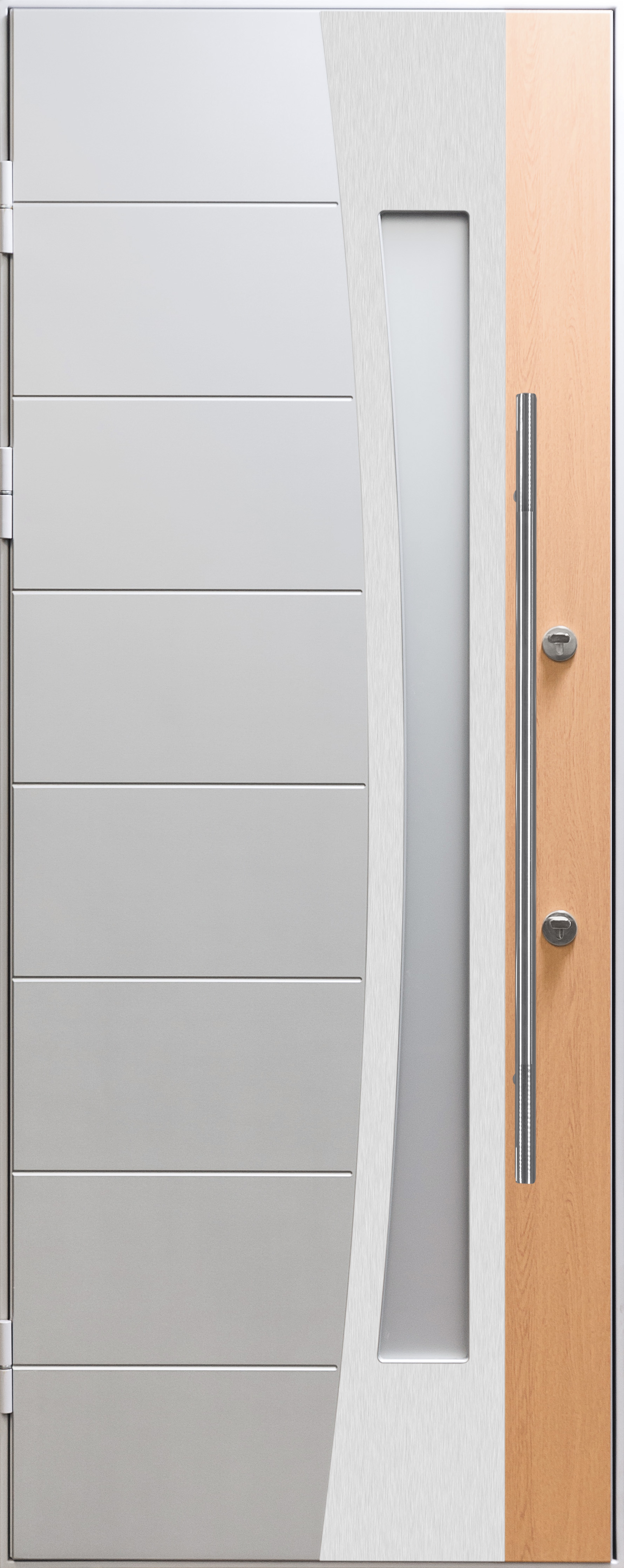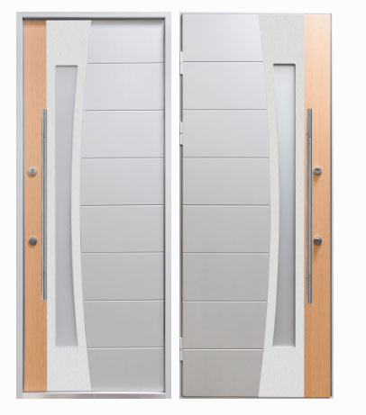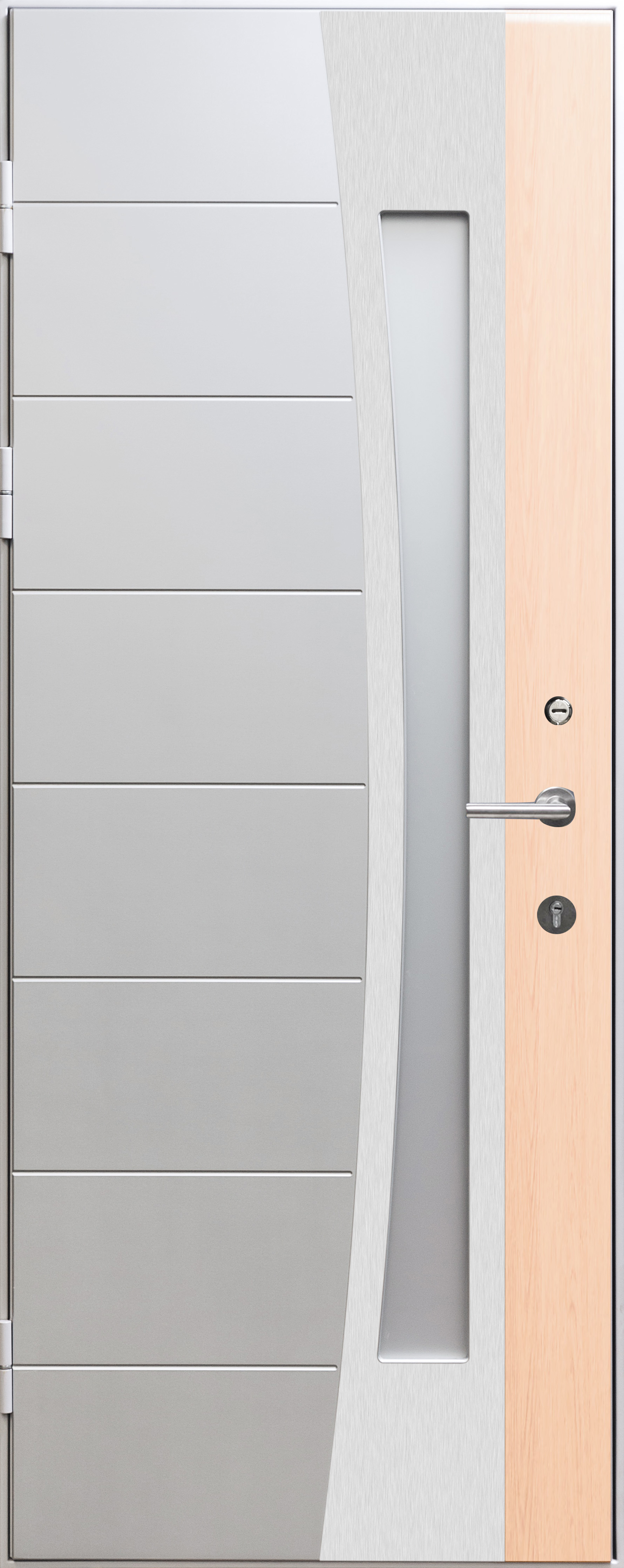 Внешняя сторона: Комбинированный МДФ 12мм уличного исполнения УФ+стеклопакет белый матовый с прозрачными полосами+рамка из нержавейки. Покрытие коробки тефлон (Турция).