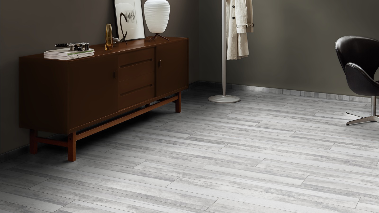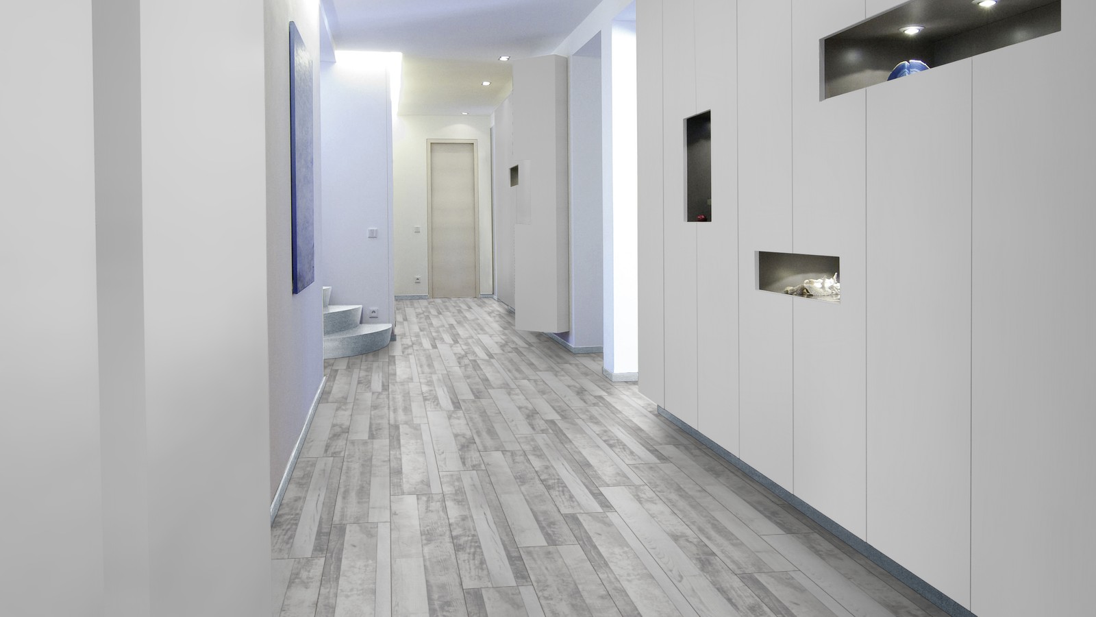 Светло-серый цвет с гармоничным замесом бетонного и темно-коричневого, рождает неповторимый и узнаваемый дизайн. Австрийский ламинат марки Кайндл сосна мультистрип кантри, превосходный образец современного стиля в урбанистичном решении, где преобладают холодные цвета и характерные отделочные материалы: стекло, металл, бетон.